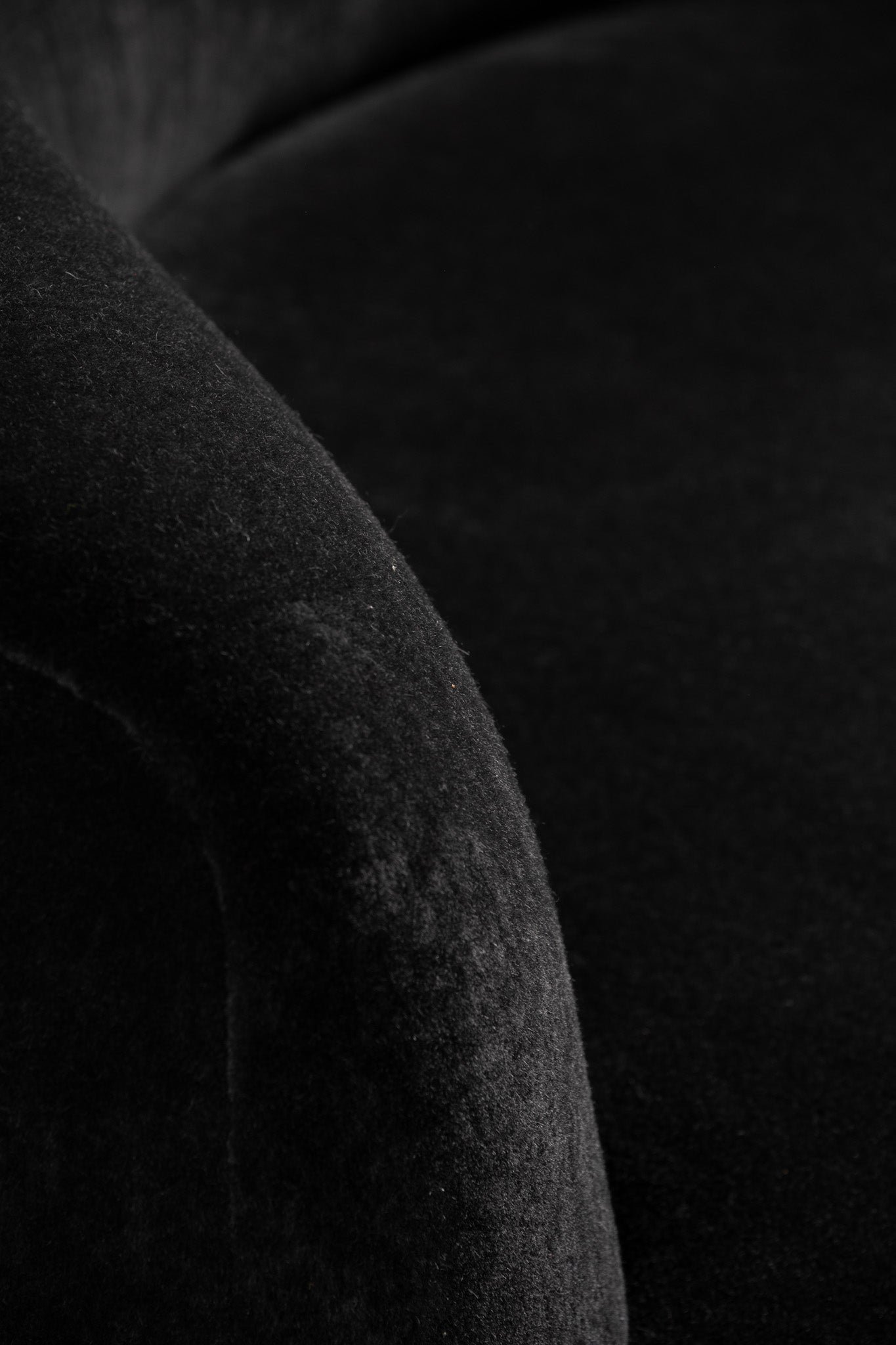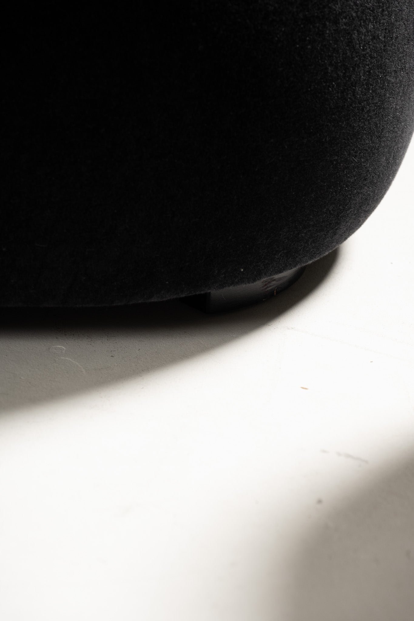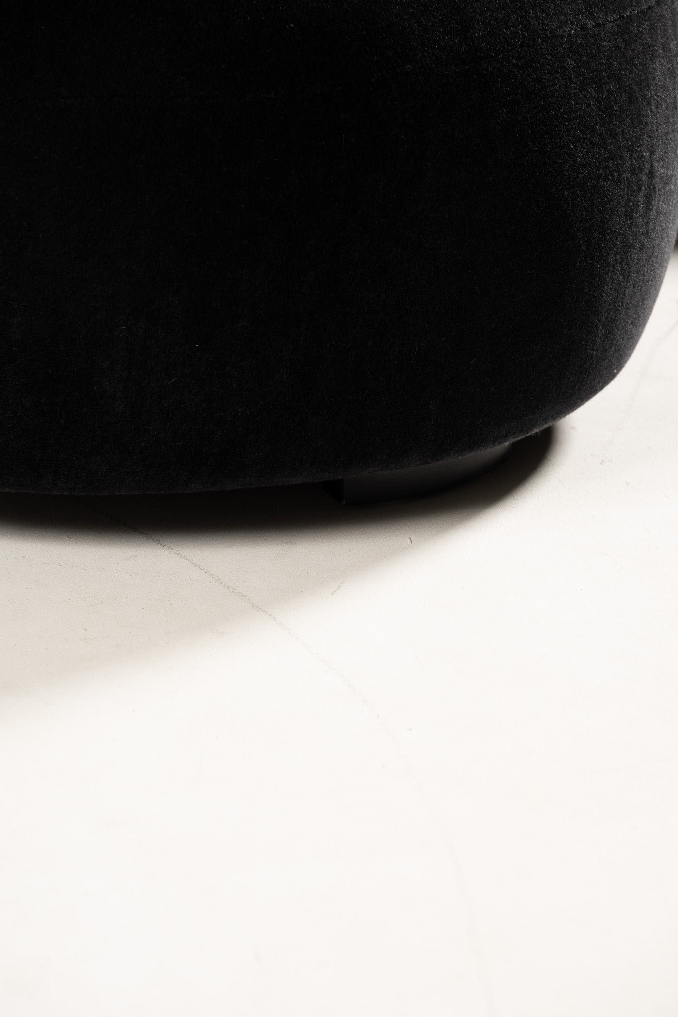 Canapé et pouf de Pierre Augustin Rose. revêtus d’un mohair noir édité par Pierre Frey et reposant sur quatre piètements en bois. Les lignes courbes. signatures du studio. s’inspirent des formes modernistes des années 1930.