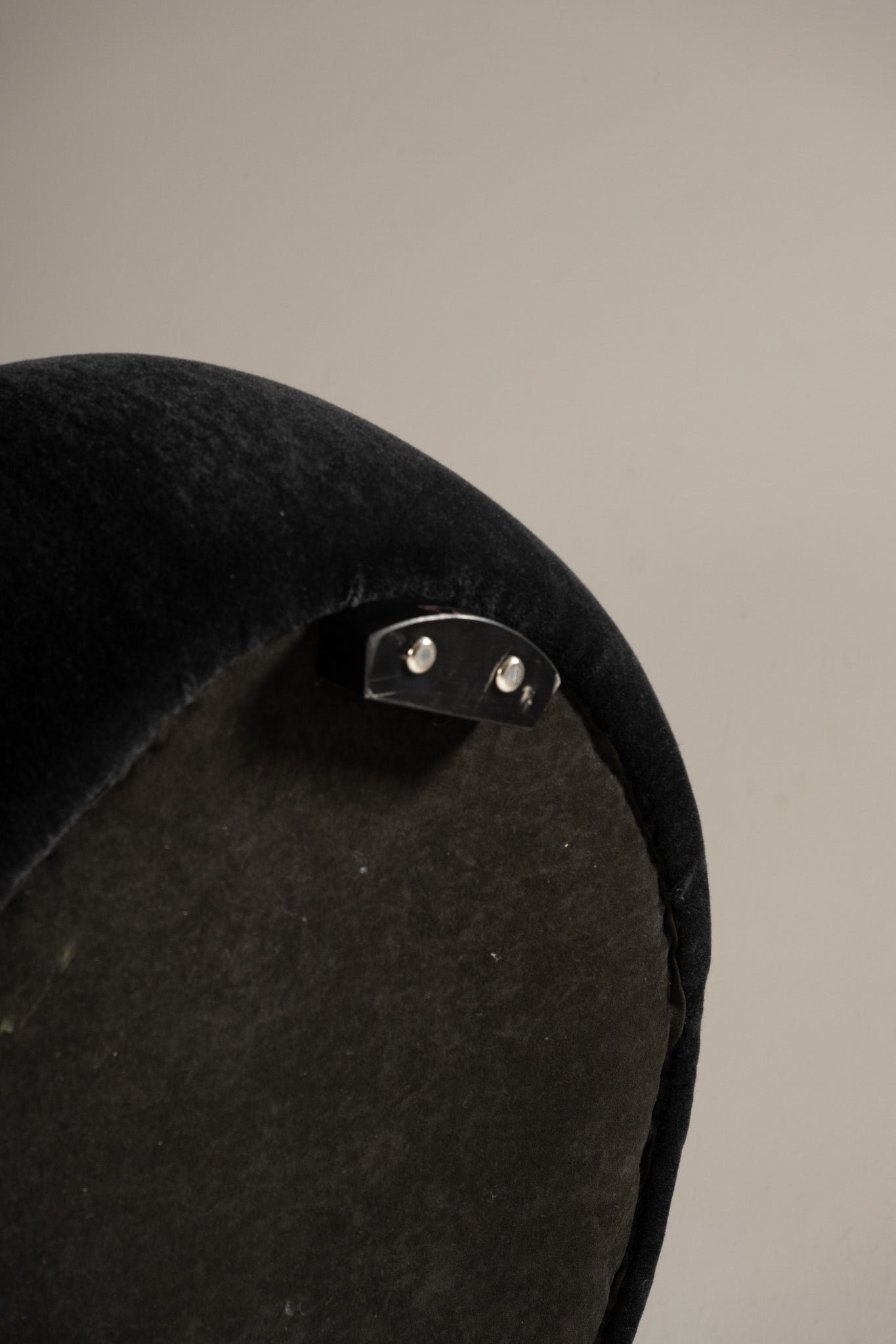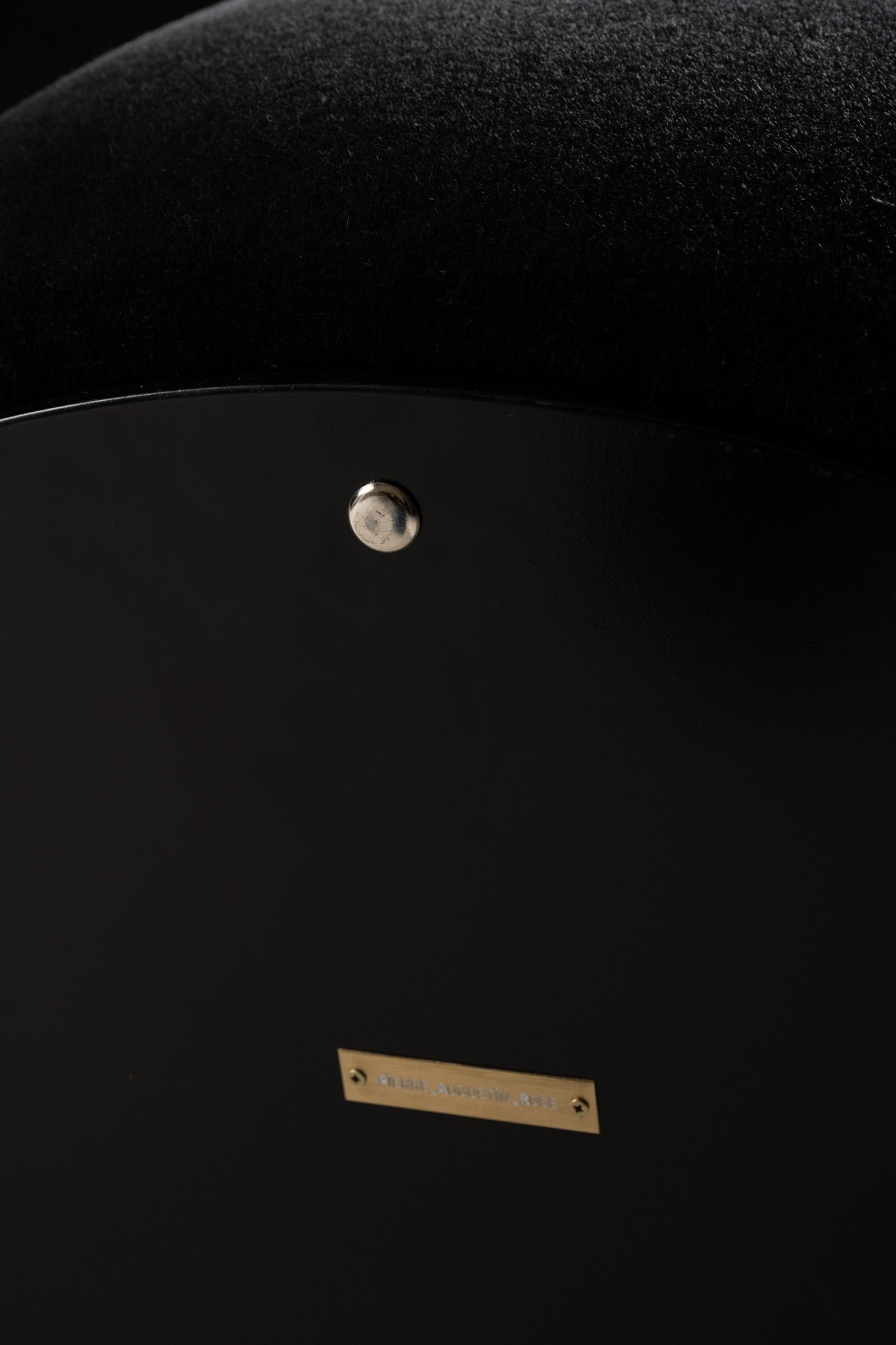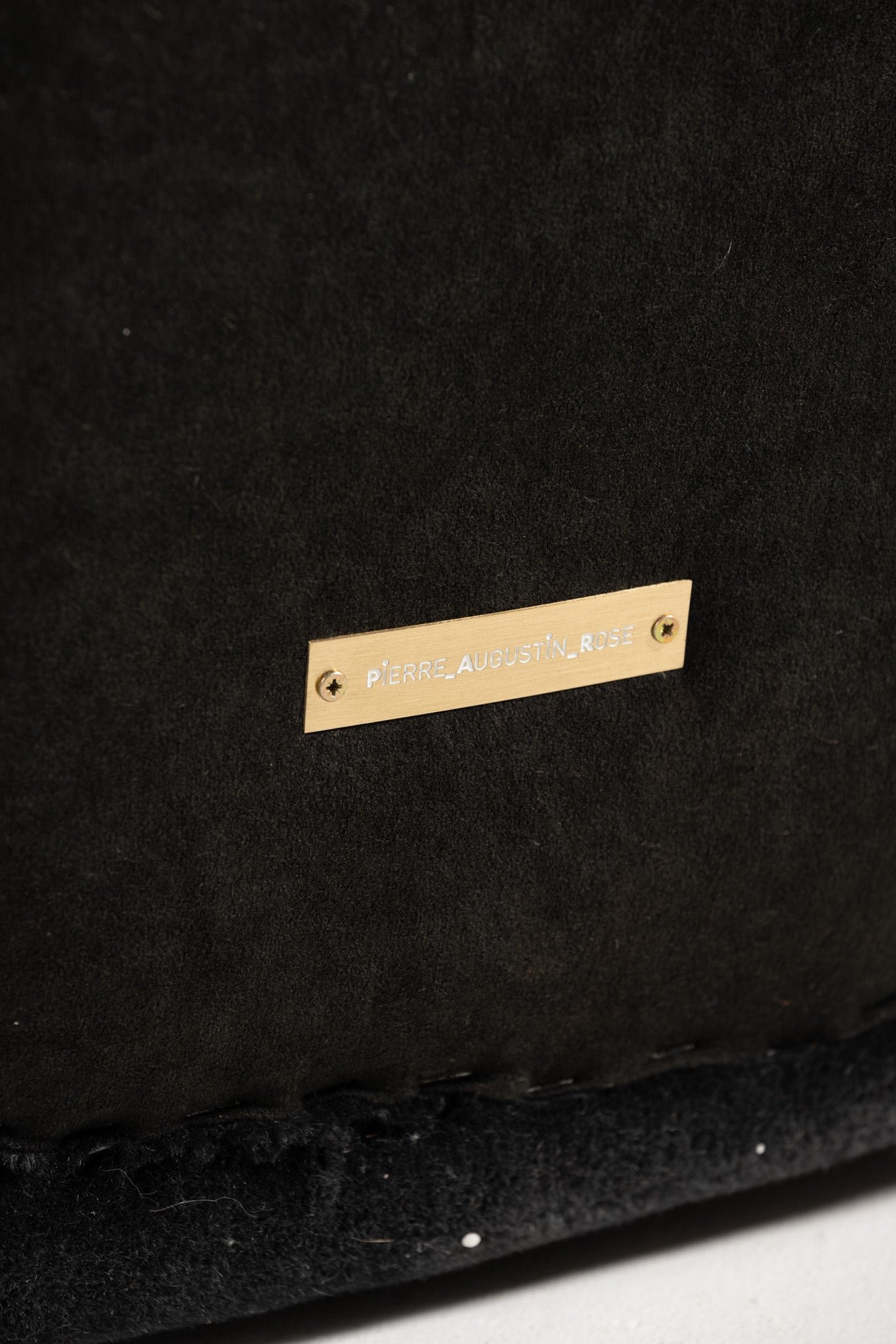 Canapé et pouf de Pierre Augustin Rose. revêtus d’un mohair noir édité par Pierre Frey et reposant sur quatre piètements en bois. Les lignes courbes. signatures du studio. s’inspirent des formes modernistes des années 1930.