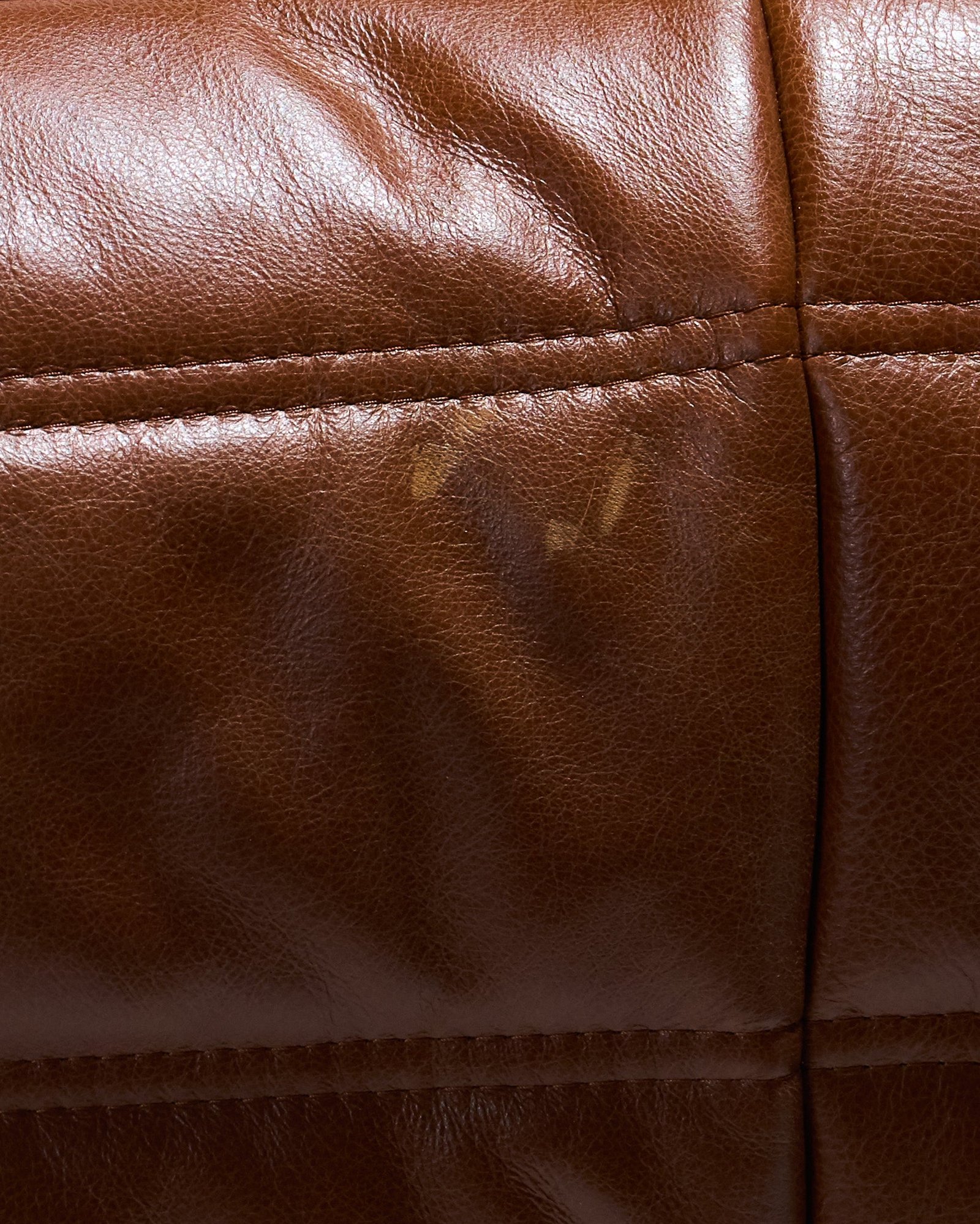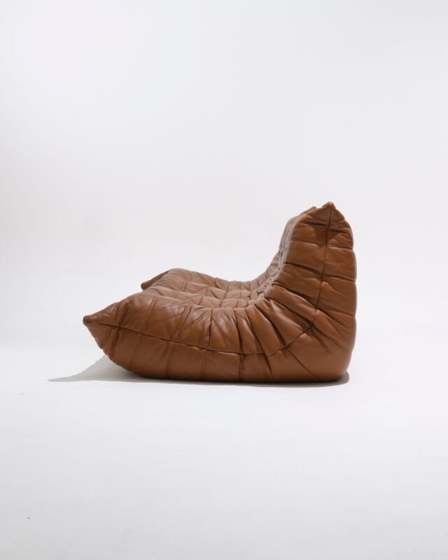 Canapé deux places TOGO du designer Michel Ducaroy (1925-2009) pour Ligne Roset dans les années 1970. Grand classique du design ce canapé entièrement en mousse est recouvert d’une housse en cuir brun d’origine. Pièce étiquetée.