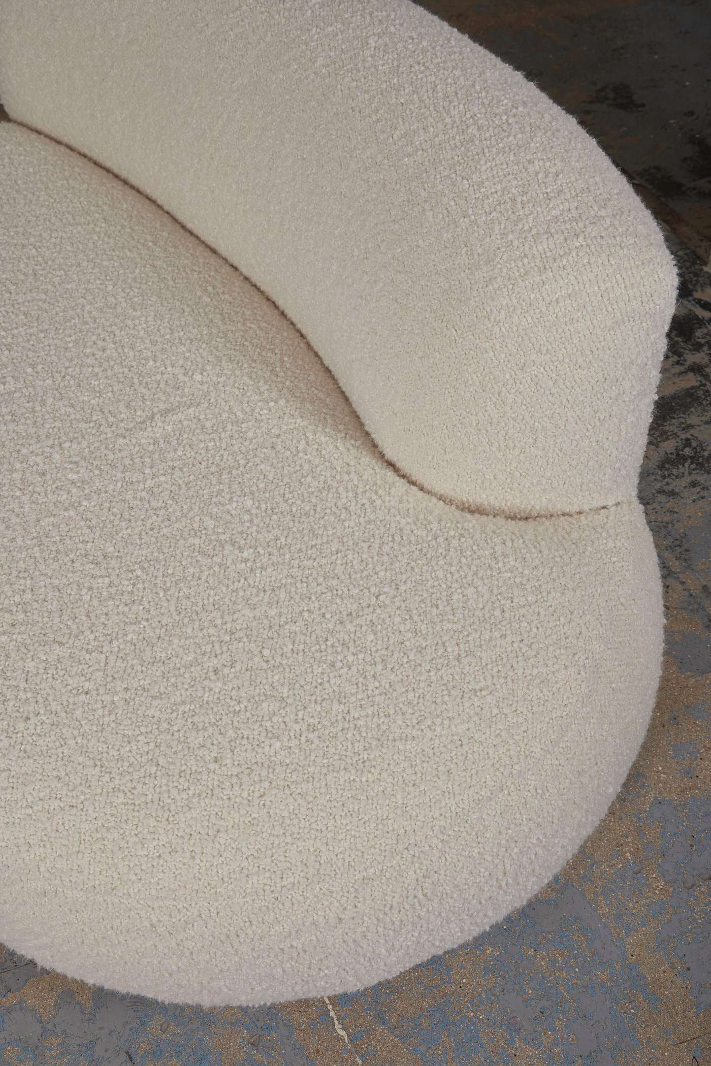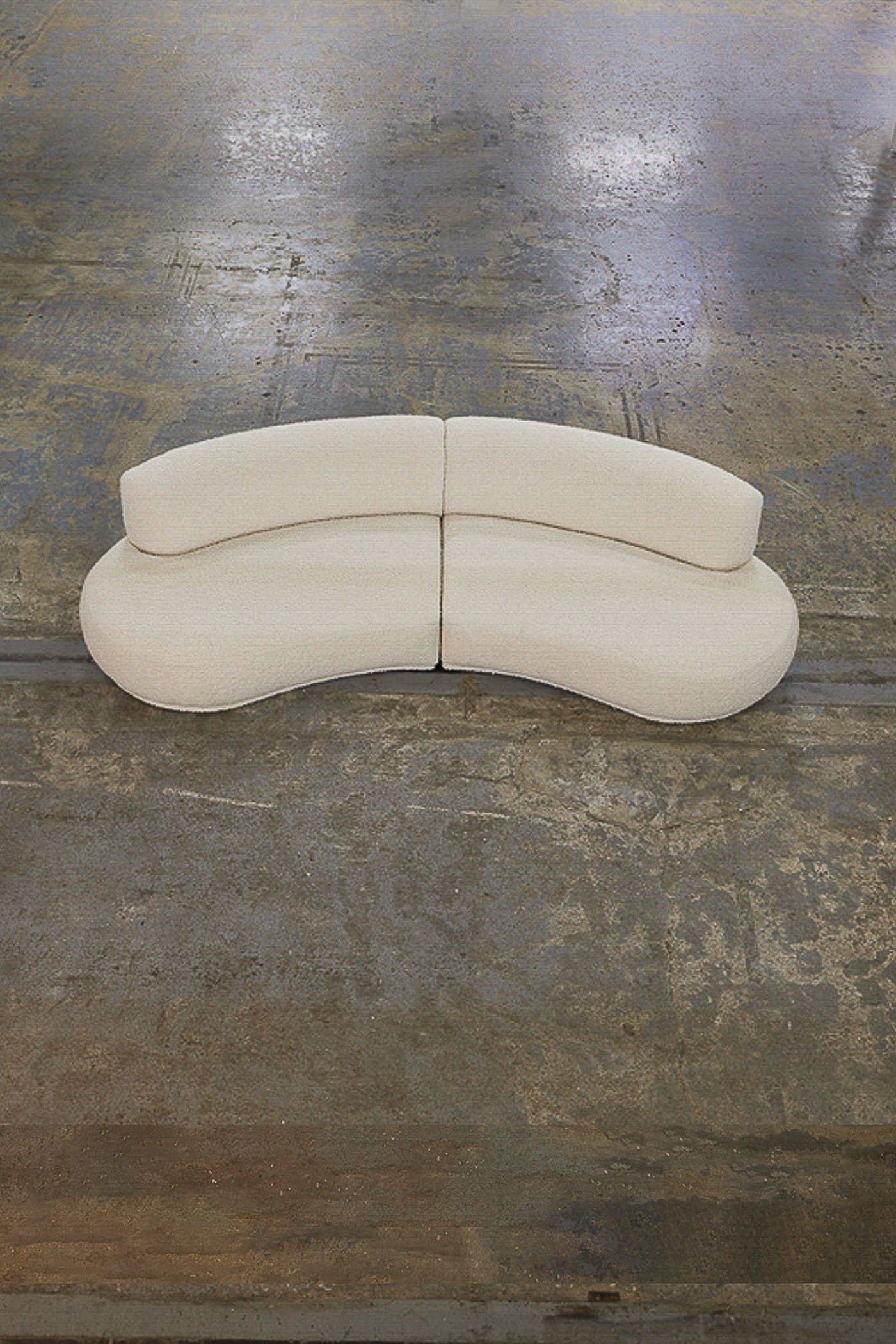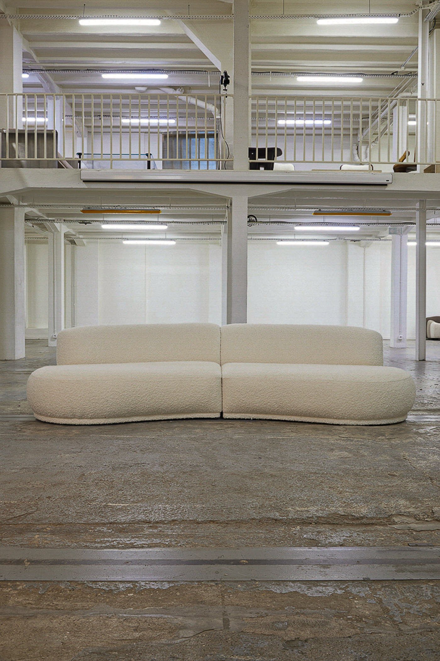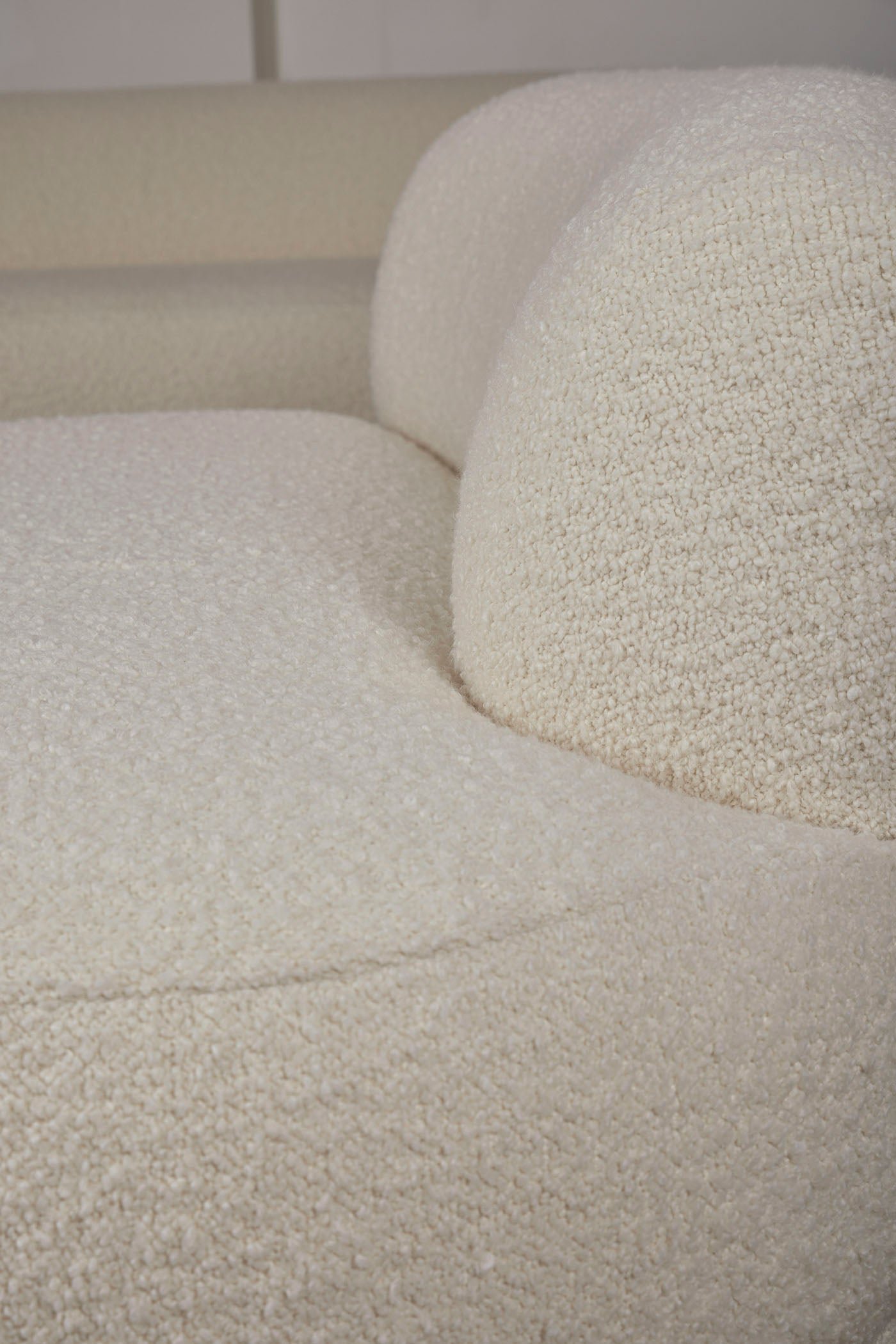 SOFA MODULABLE EN DEUX PARTIES EN BOUCLETTE BLANCHE. SA LIGNE EST LÉGÈREMENT COURBE ET ÉTIRÉE. RAPPELANT LE DESIGN SCANDINAVE OU LE DESIGN FRANÇAIS DES ANNÉES 1930. EN EXCELLENT ÉTAT. IL EXISTE ÉGALEMENT EN TROIS MODULES.