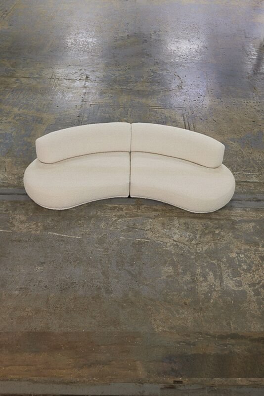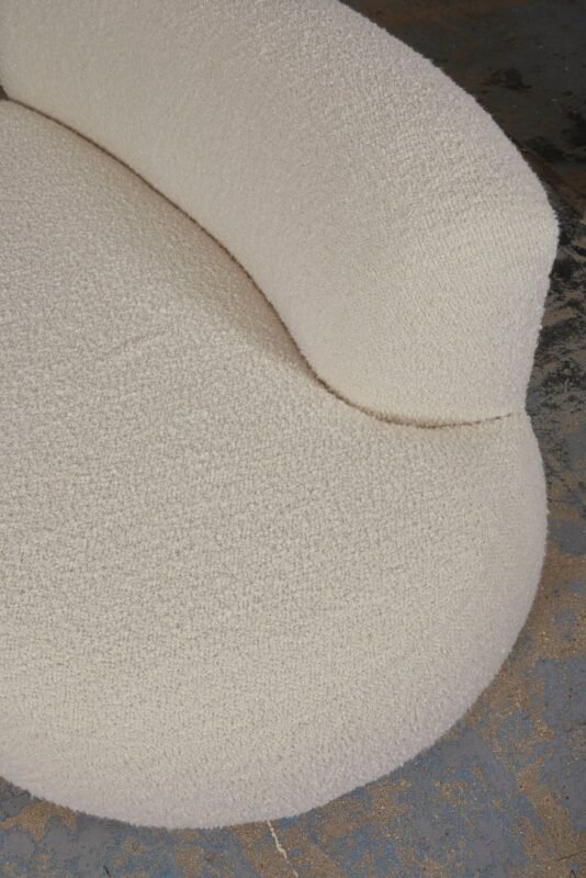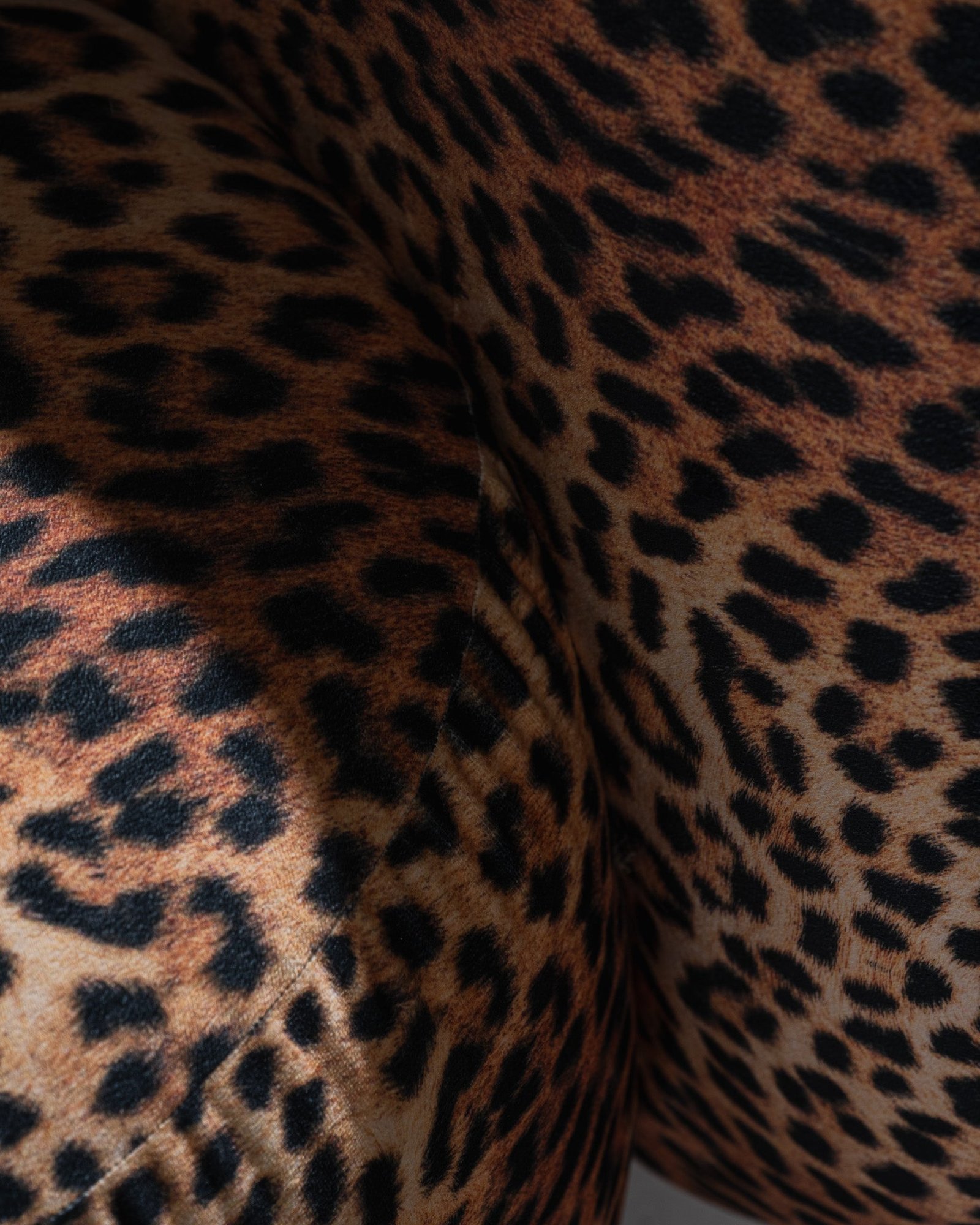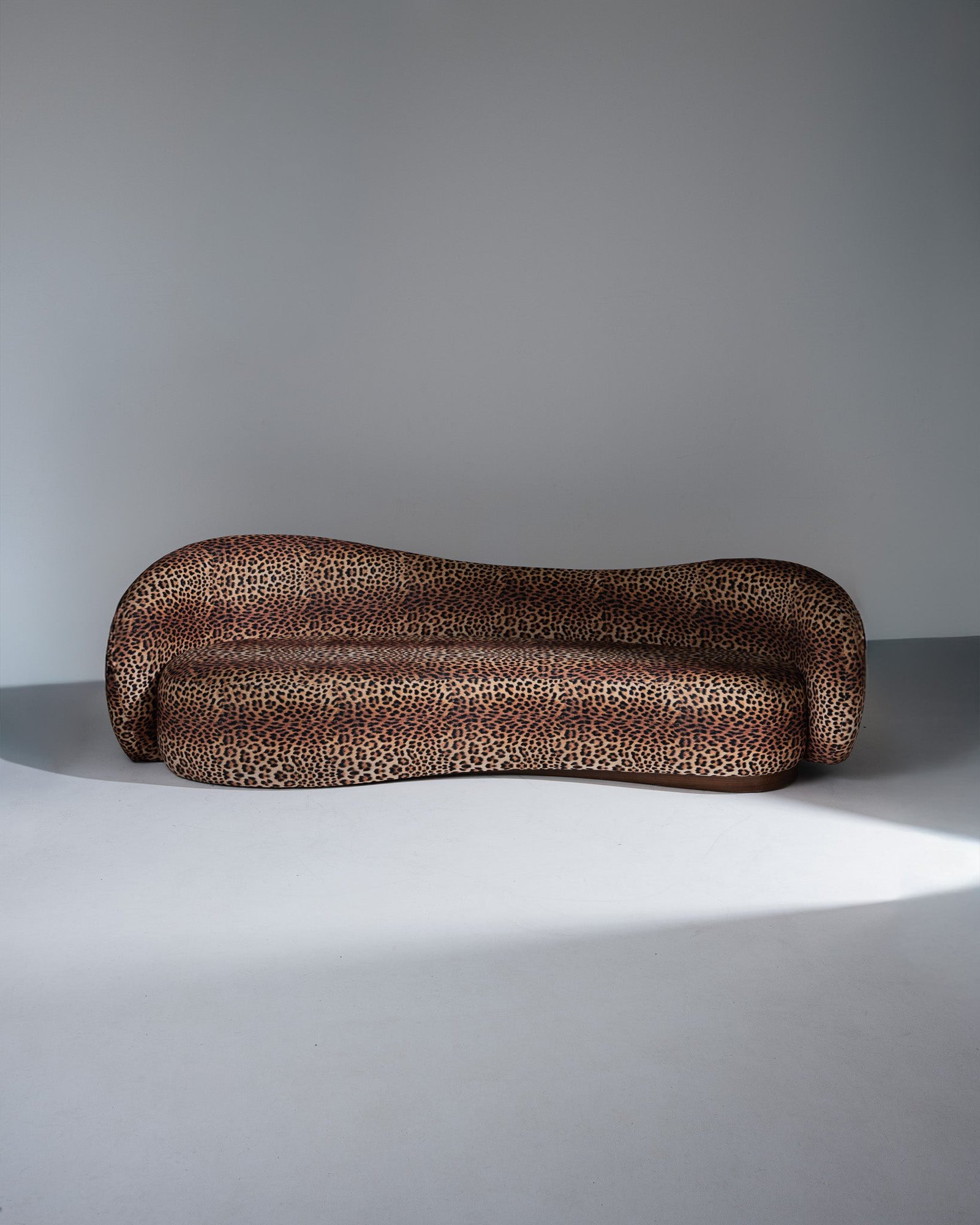 Grand canapé 5 places entièrement tapissé d’un tissu à motif léopard. Forme organique avec assise continue et courbes enveloppantes. Structure interne en bois massif. visible sur la partie inférieure.