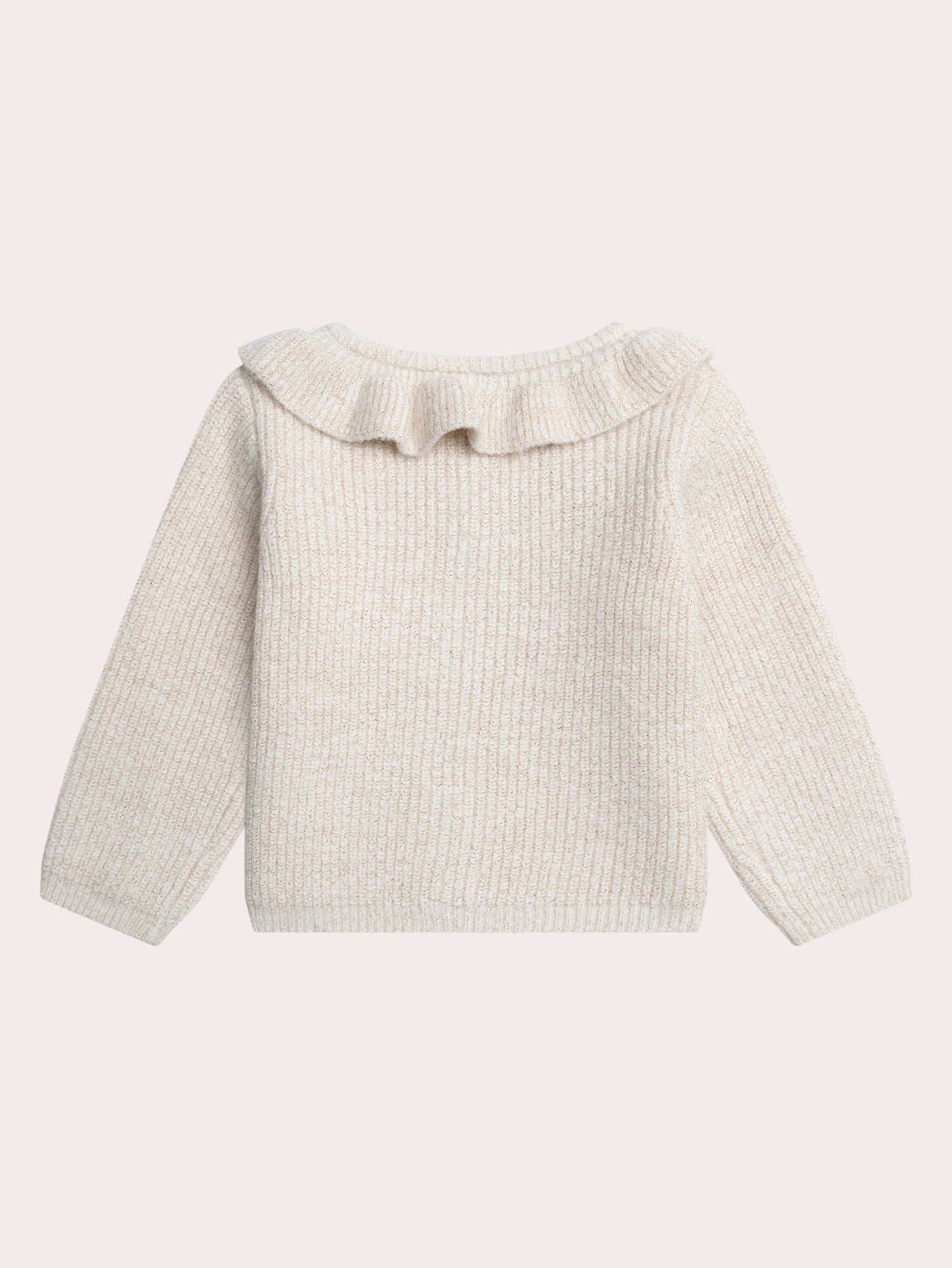 Ce cardigan écru est conçu pour les bébés filles et parfait pour les journées fraîches. Réalisé en tricot doux. il présente un col volanté et une ouverture boutonnée sur le devant. Une délicate broderie oiseau sur la poitrine ajoute une touche poétique et tendre.