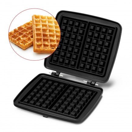 Jusqu’à 8 plaques interchangeables disponibles. dont les plaques uniques de gaufre de Bruxelles et de gaufres fourrées.