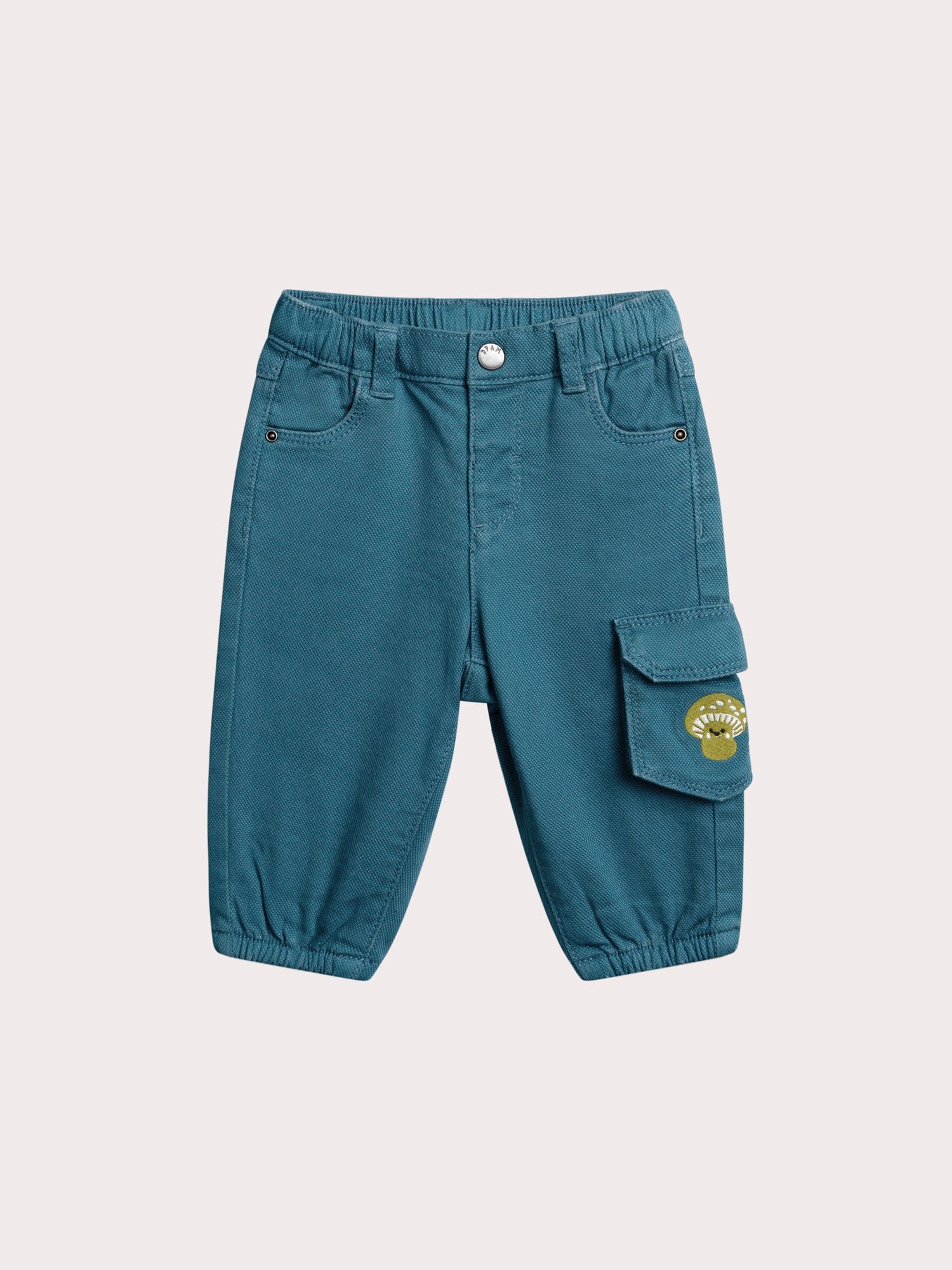 Ce pantalon bleu paon en toile est conçu pour les bébés garçons. idéal pour les saisons douces. Sa matière légère assure confort et liberté de mouvement. La poche cargot avec animation champignon apporte une touche originale et amusante à ce basique.