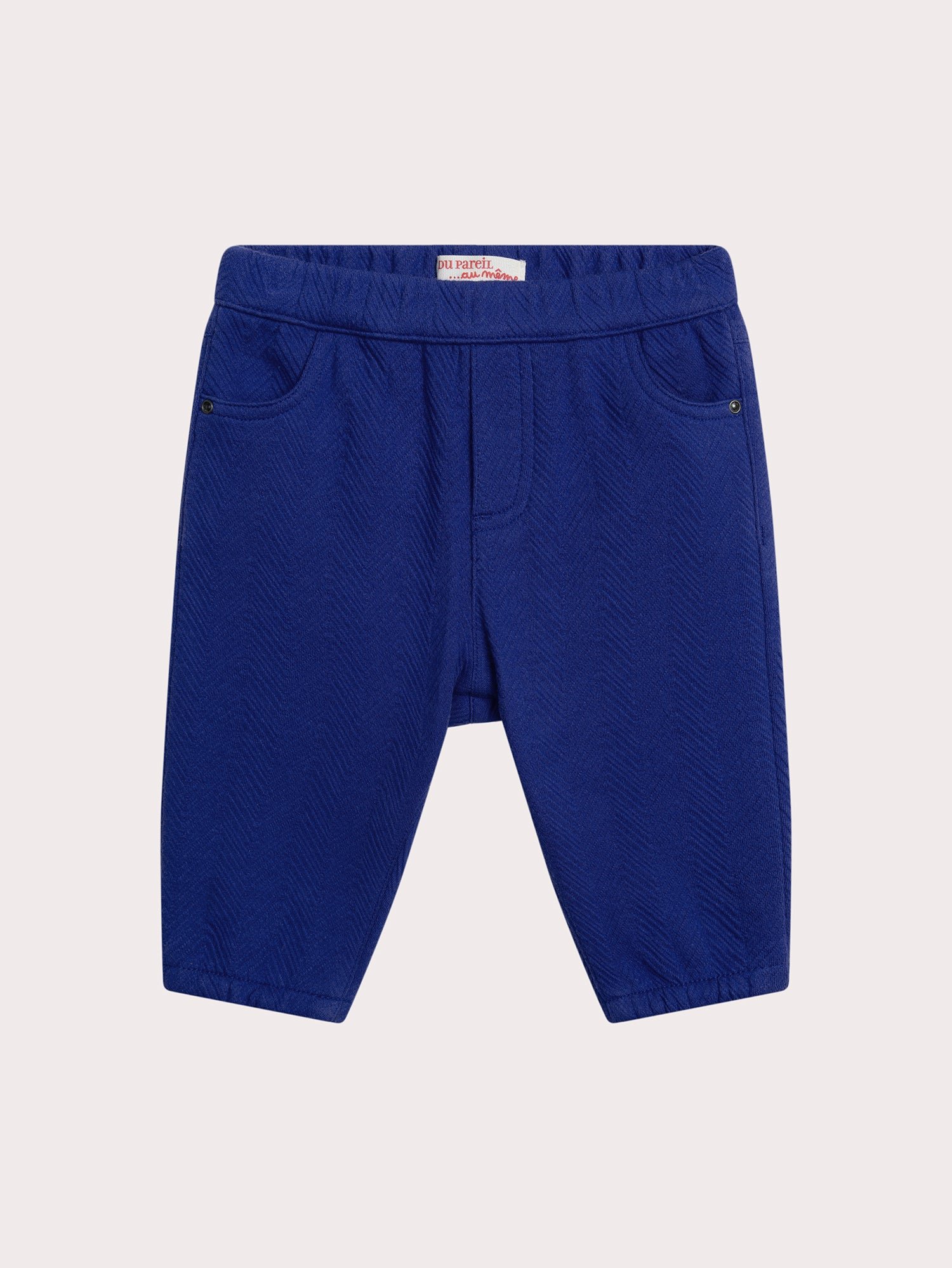 Ce pantalon bleu est conçu pour les bébés garçons et convient aux journées fraîches. Réalisé en molleton chevron. il allie confort et douceur au quotidien. Une animation chien sur la poche apporte une touche joyeuse et amusante.