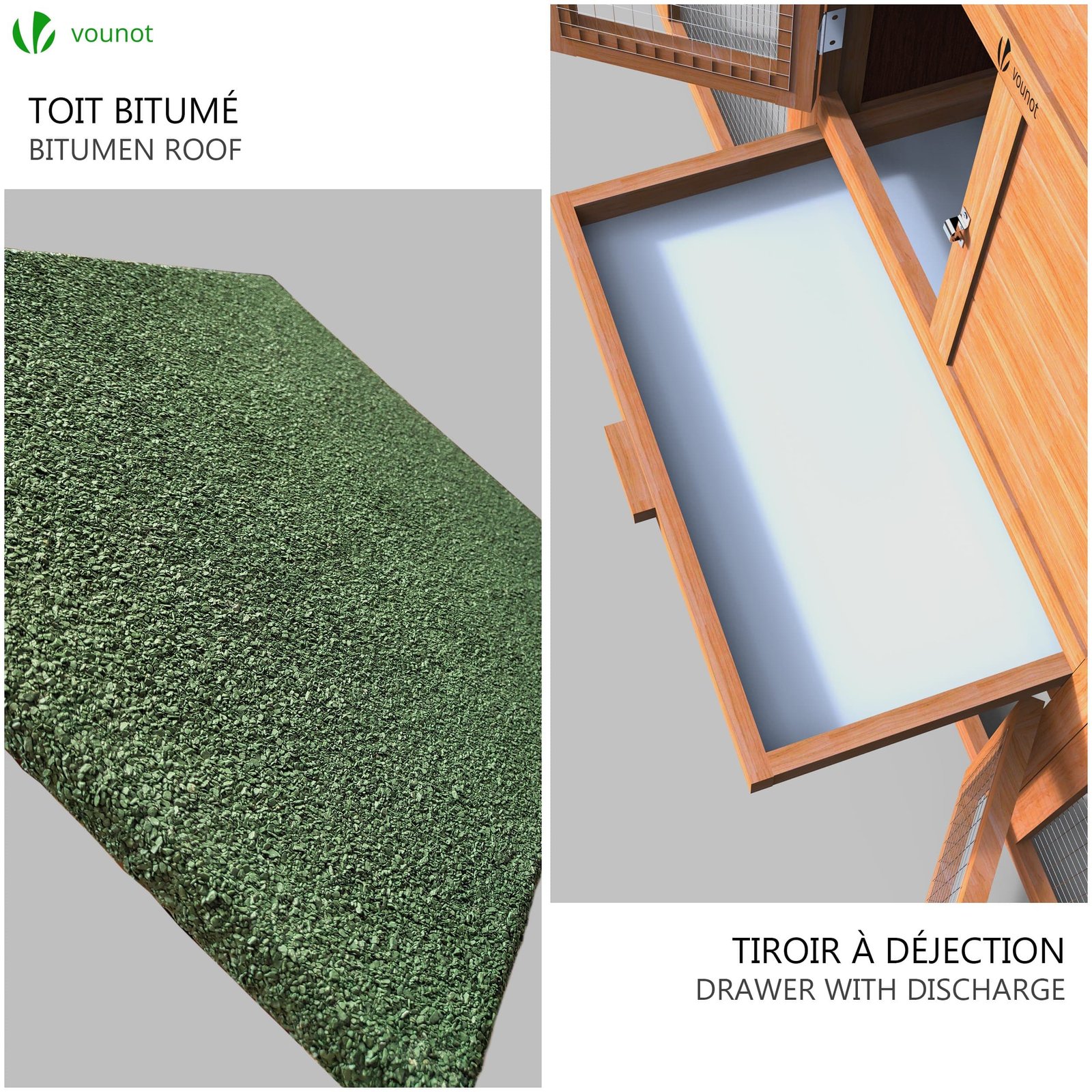 Avantages du produit – Toit imperméable Grande Espace Notre poulailler dispose de deux espaces d’activité. Vos animaux peuvent profiter librement et en toute sécurité de l’air frais et du soleil à l’intérieur du grillage.