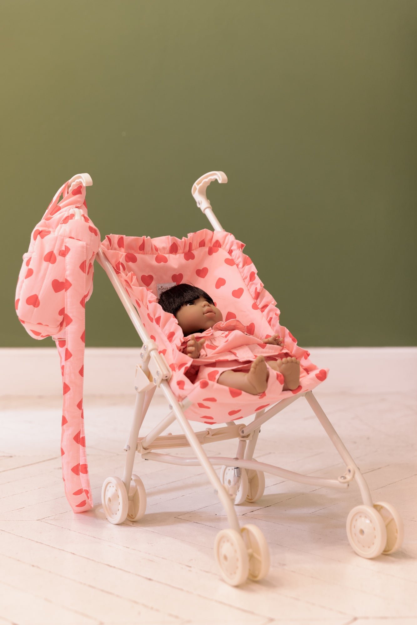 Découvrez la poussette de poupée BONTON en collaboration avec MINIKANE. l’accessoire incontournable pour les enfants qui souhaitent promener leurs poupées avec élégance ! Avec son imprimé coeur. cette poussette pliable allie style et praticité. Offrez à vos enfants un moment de jeu stylé avec cette poussette de qualité. parfaite pour les balades en intérieur comme en extérieur. Dépliée la pousette mesure 63 cm de longeur. 11 cm de largeur et 11 cm de hauteur.