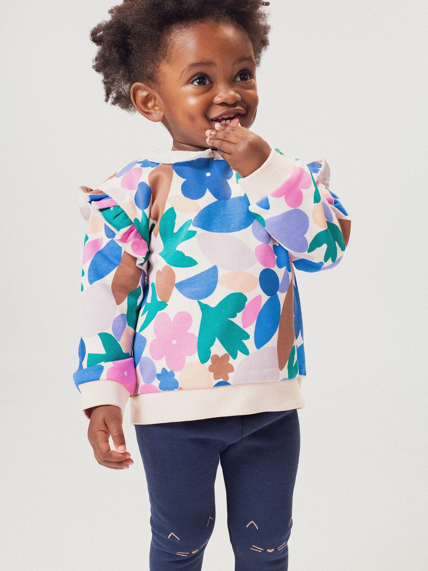 Ce sweat-shirt fleuri est conçu pour les bébés filles et idéal pour les journées fraîches. Confectionné en molleton gratté. il est doux et confortable avec des empiècements volantés au niveau des emmanchures. Son imprimé fantaisie ajoute une note joyeuse et délicate à la tenue.